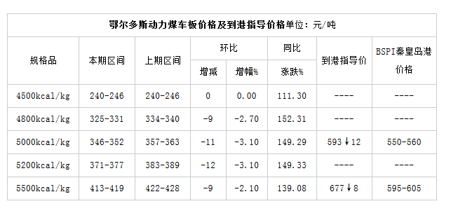 综上所述,供需结构紧张局面改善、下游市场价格下行传导影响本期鄂尔多斯动力煤价格指数下降、坑口价格、车板价格跌平互现、到港指导价格全面下降。