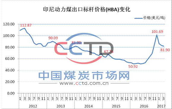 印尼能源与矿产资源部(Ministry of Energy and Mineral Resources)发布2017年3月份的动力煤参考价格(the Harga Batubara Acuan, or HBA)为81.9美元/吨,已现年初以来连续3个月下降,累计降低20美元/吨,比上年末峰值下降19.5%。
