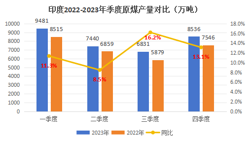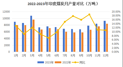 按照自然年(1.1-12.31)产量来看,2023年印度月度产量加总为9.69亿吨,同比2022自然年增长超12%。