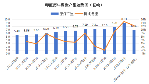 其中,2021-22财年,印度的煤炭产量提高到7.78亿吨(同比增长8.68%);2022-23财年印度煤炭产量进一步提升至8.93亿吨,同比增速首次达到两位数增幅,高达14.77%;2023-2024财年截至23年12月底,印度煤炭产量初步估计为6.84亿吨,同比增速继续保持两位增速,为12.4%。