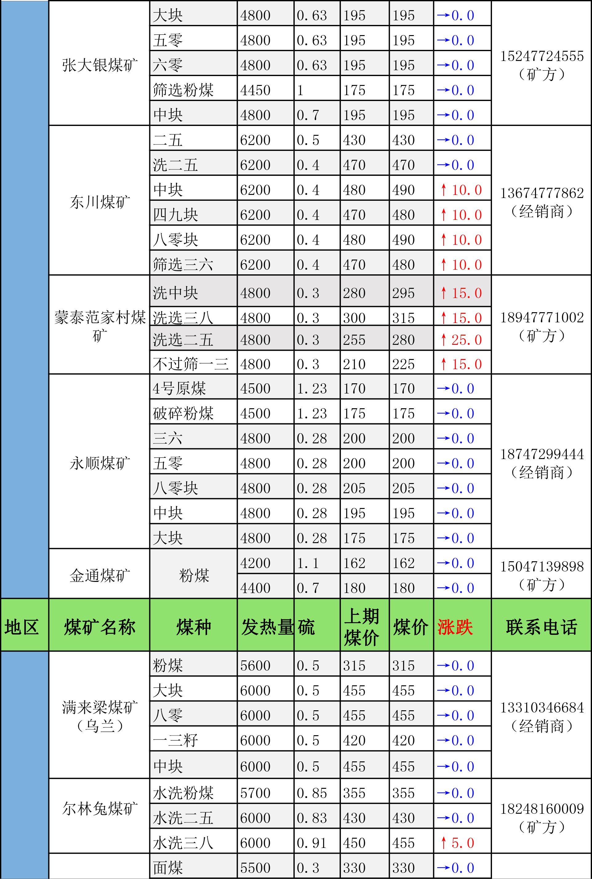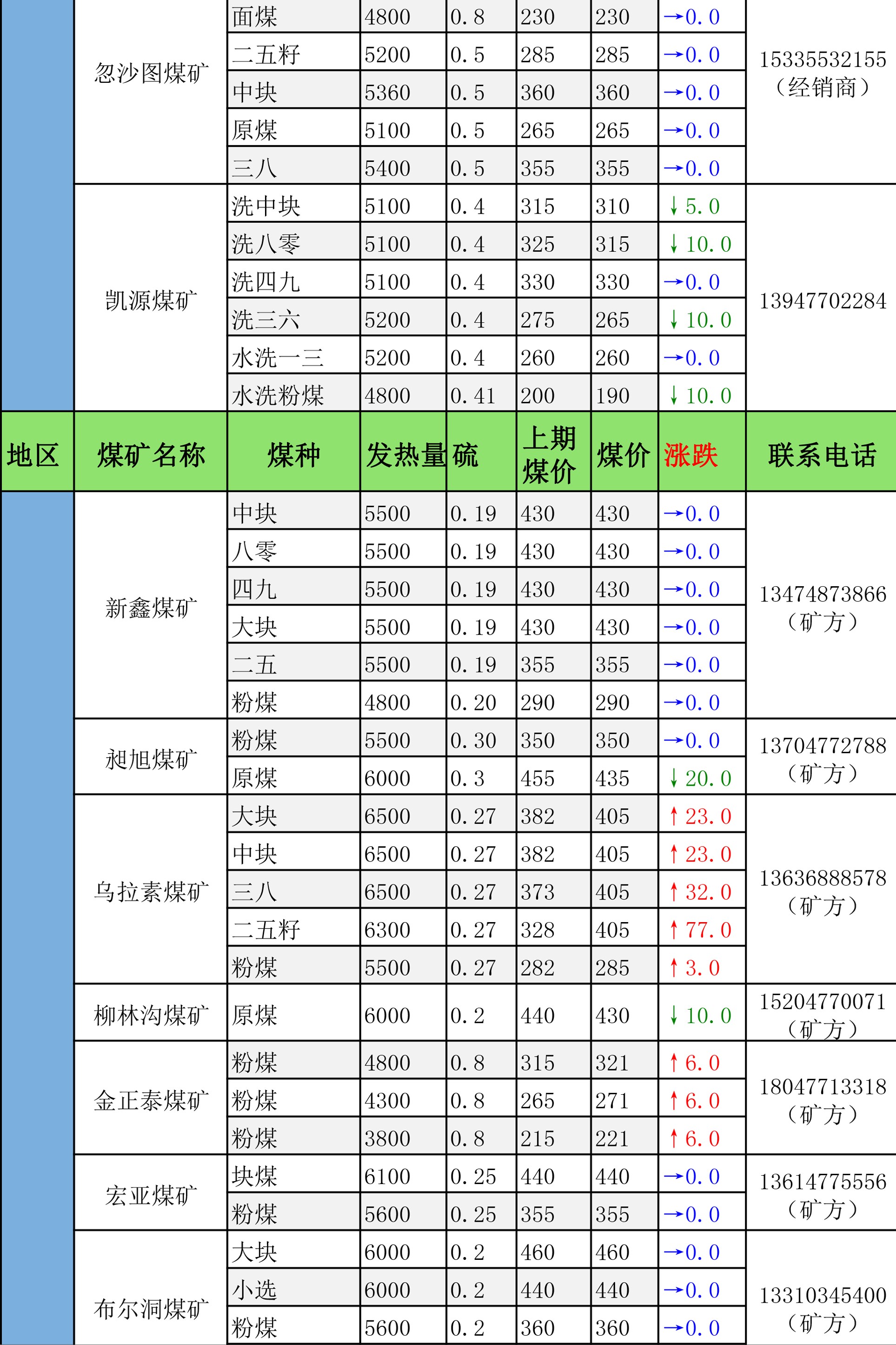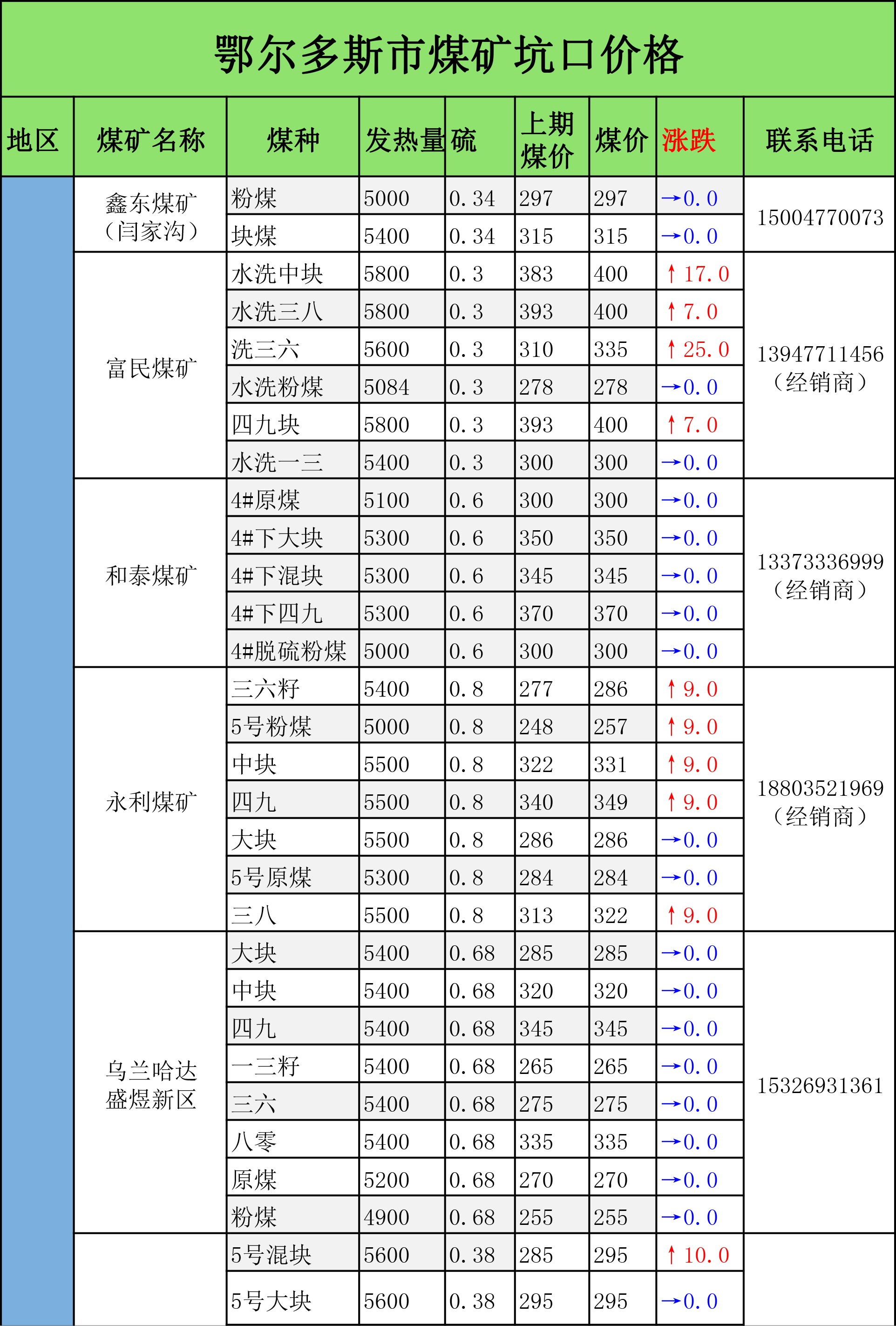 鄂尔多斯市最新煤炭坑口报价