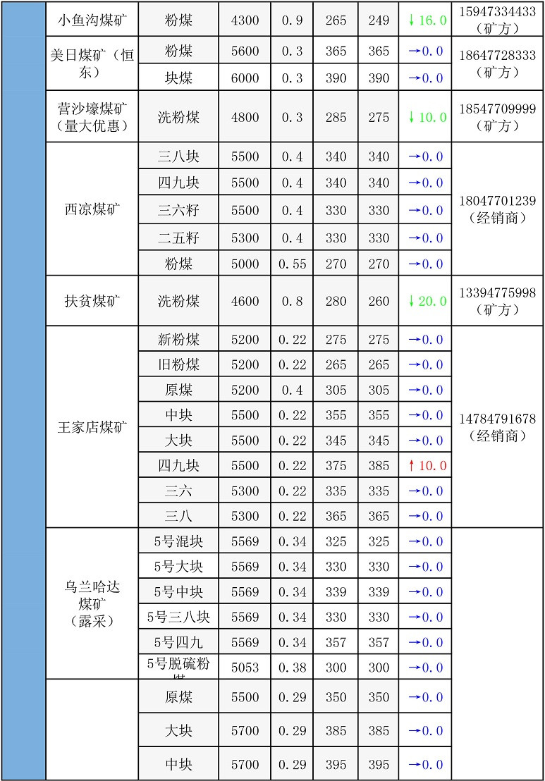11月24~28日鄂尔多斯地区煤矿坑口价格整体趋势平稳,维持上期不变,有小部分煤价调整,有升有降:神山地区10家煤矿,3家煤矿部分煤种煤价进行下调,下调金额5—15元;准旗地区30家煤矿,7家煤矿部分煤种价格进行下调,下调金额5—20元,3家煤矿部分煤种煤价进行上调,上调金额5—15元;东胜地区13家煤矿,4家煤矿部分煤种煤价进行下调,调价金额5—10元,2家煤矿部分煤种煤价进行上调,上调金额5—10元;伊旗地区25家,5家煤矿部分煤种煤价进行下调,下调金额5-—5元,1家煤矿部分煤种煤价进行上调,上调金额6元;达旗2家煤矿,1家煤矿部分煤种煤价进行下调,下调金额5元;乌审旗1家煤矿,未进行调价。