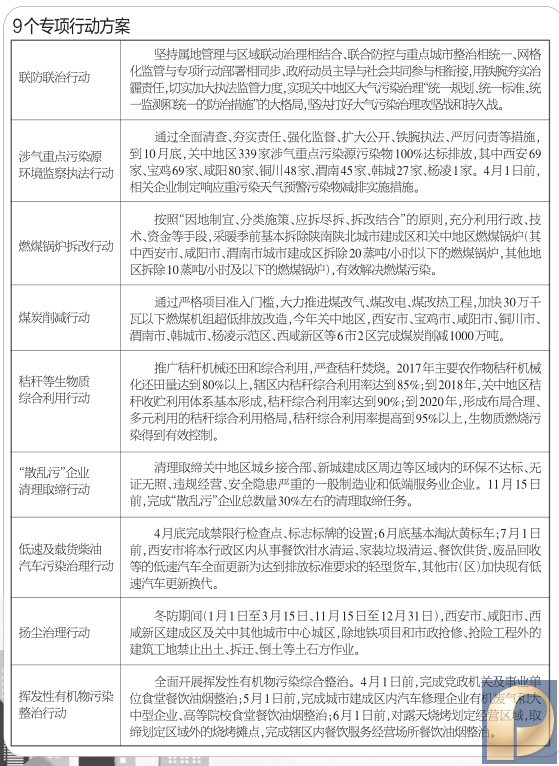 陕西省日前对外介绍了《陕西省2017年铁腕治霾“1+9”行动方案》,即“铁腕治霾·保卫蓝天2017年工作方案”+联防联治专项行动方案、关中地区煤炭削减专项行动方案、秸秆等生物质综合利用专项行动方案、“散乱污”企业清理取缔专项行动方案、低速及载货柴油汽车污染治理专项行动方案、挥发性有机物污染整治专项行动方案、涉气重点污染源环境监察执法专项行动方案、燃煤锅炉拆改专项行动方案、扬尘治理专项行动方案等9个专项行动方案。
